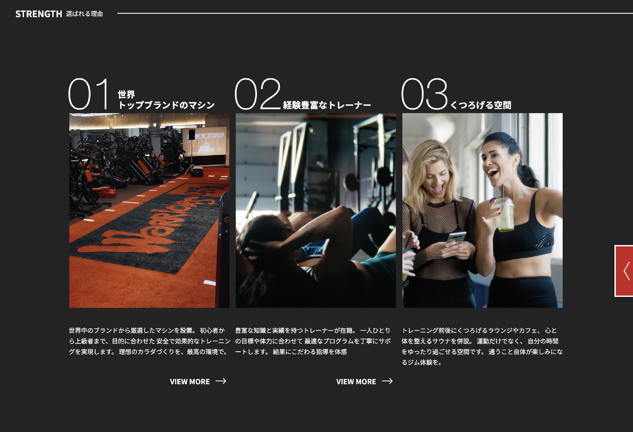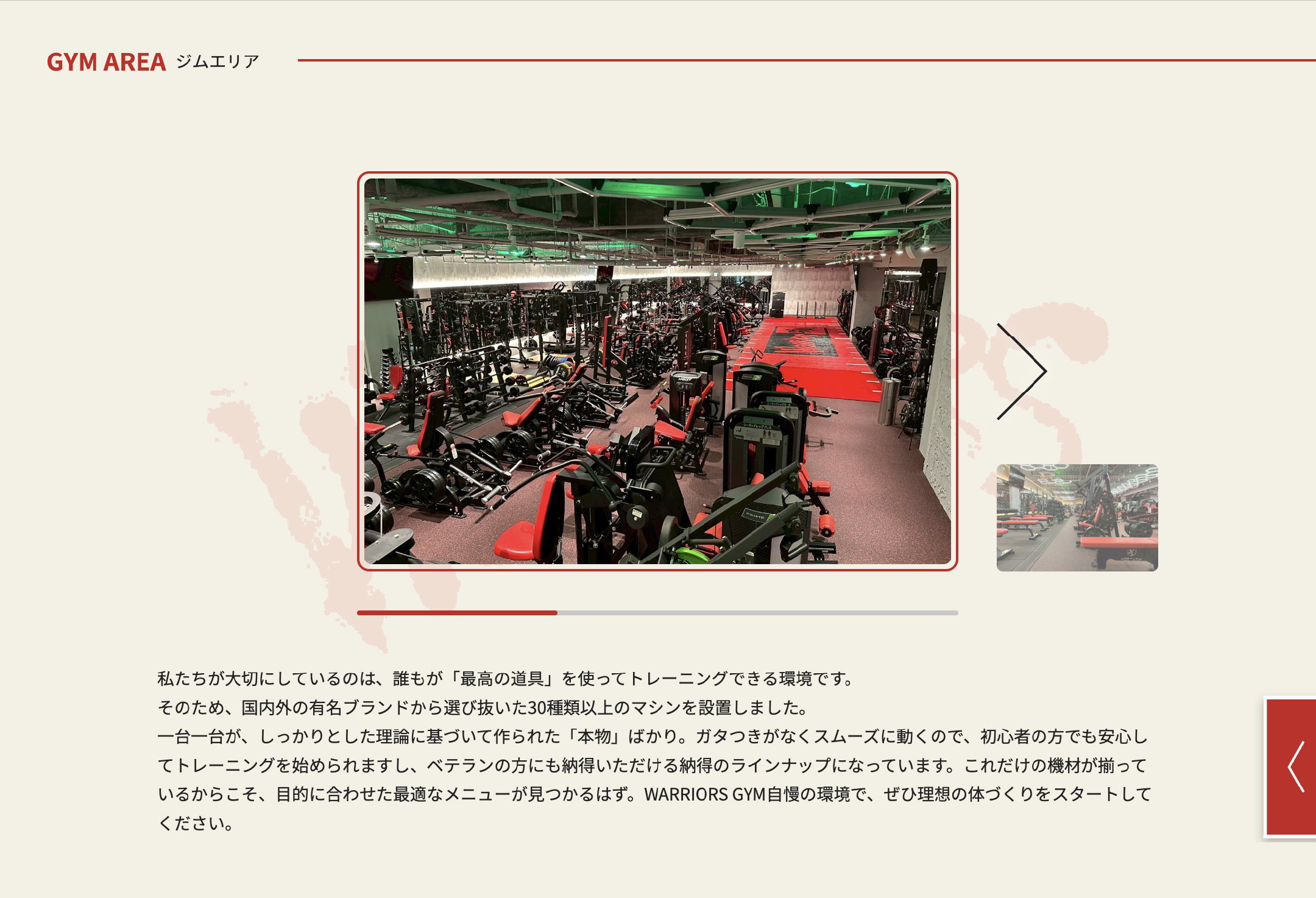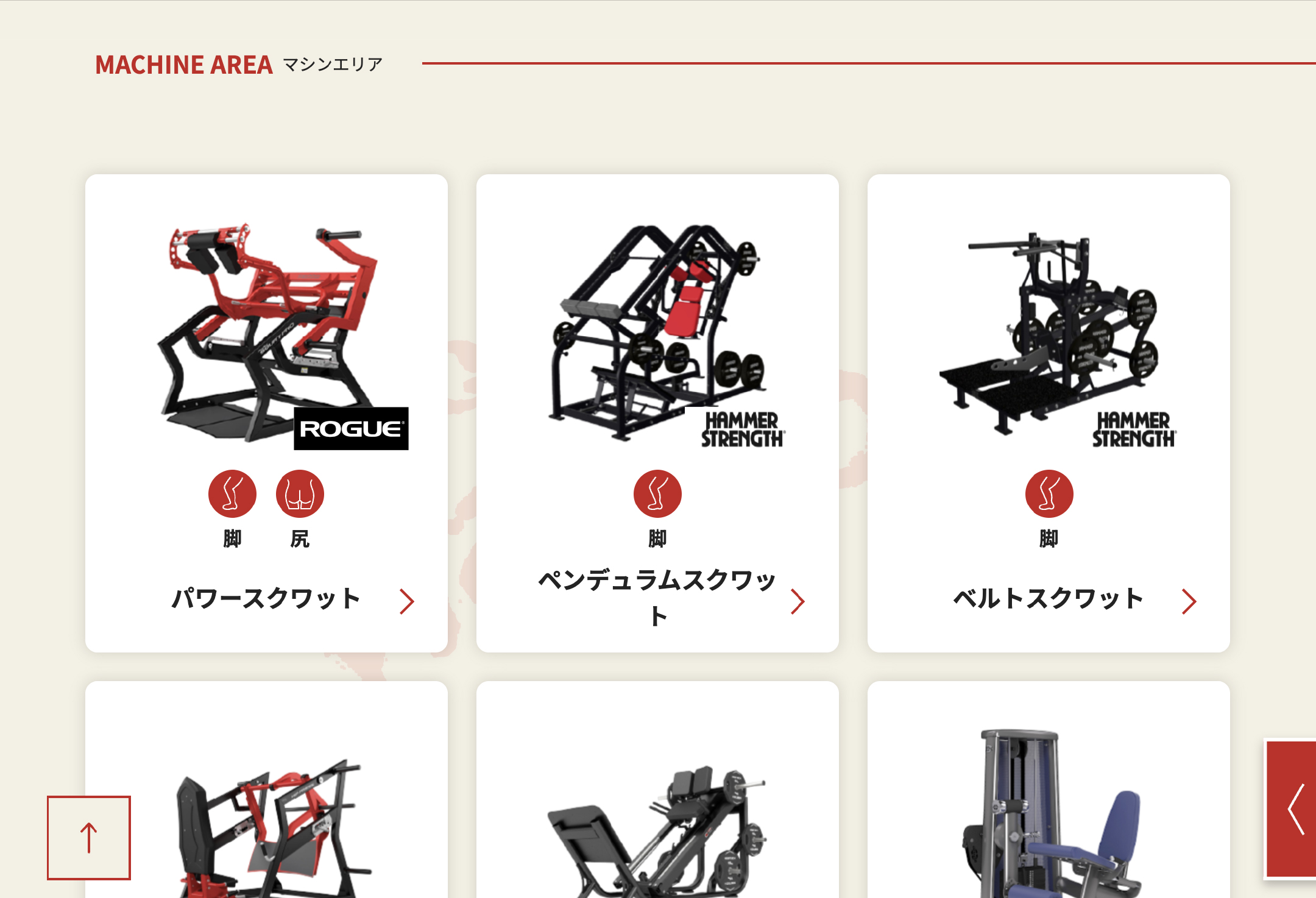 本物トレーニーからすると、どんなマシンで鍛えられるのか?と共にそのマシンがどのブランドのものか?も気になるもの。そんな入会への必須条件と言っても過言ではないマシンの一覧ページのUI・UXをピクセル単位まで掘り下げて見やすく設計しました。